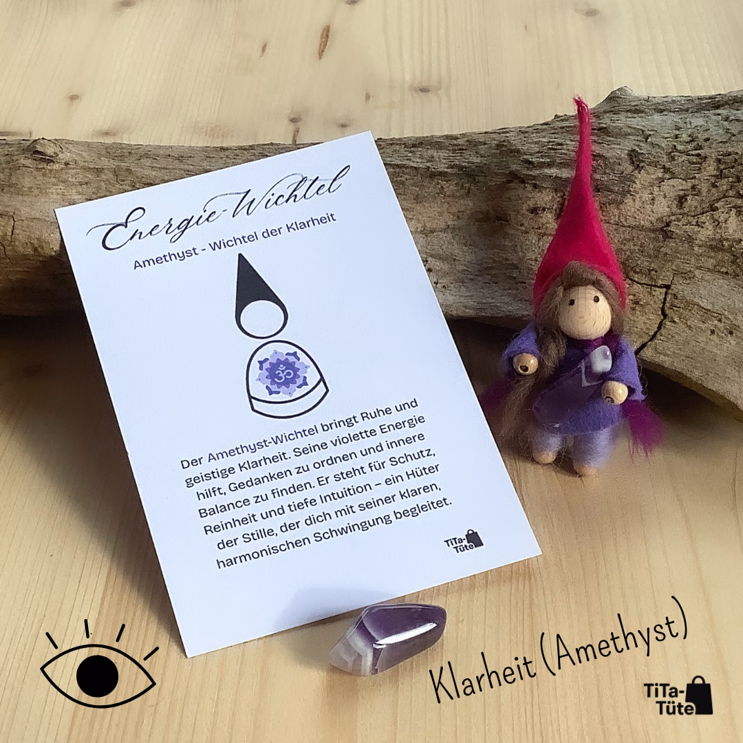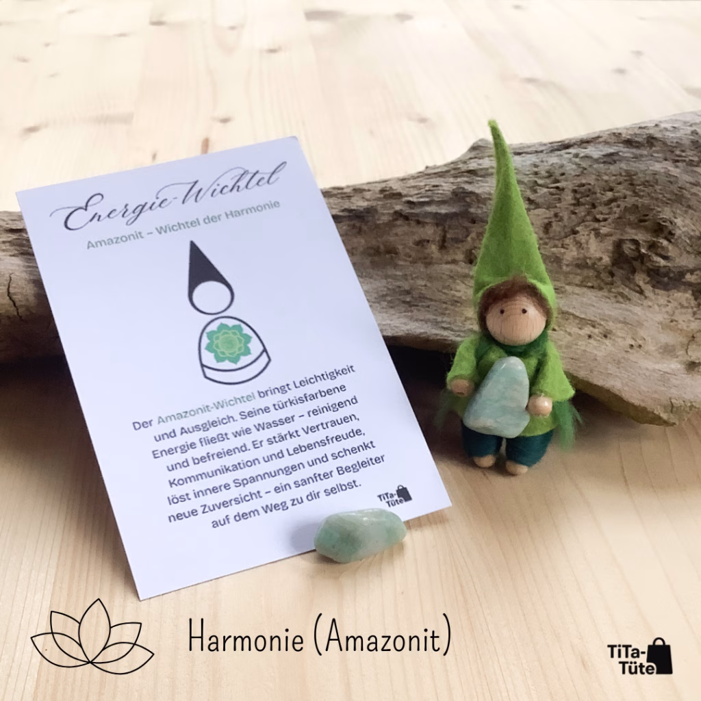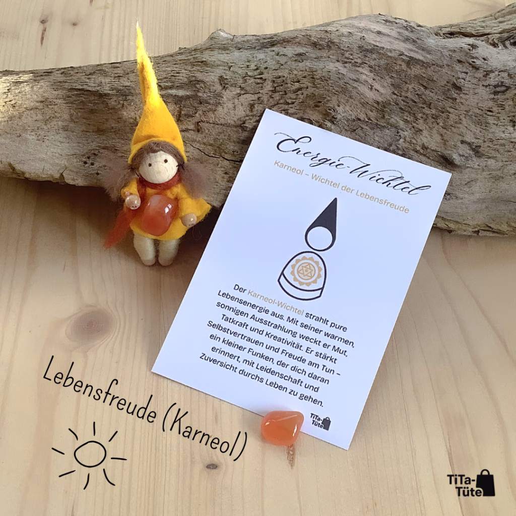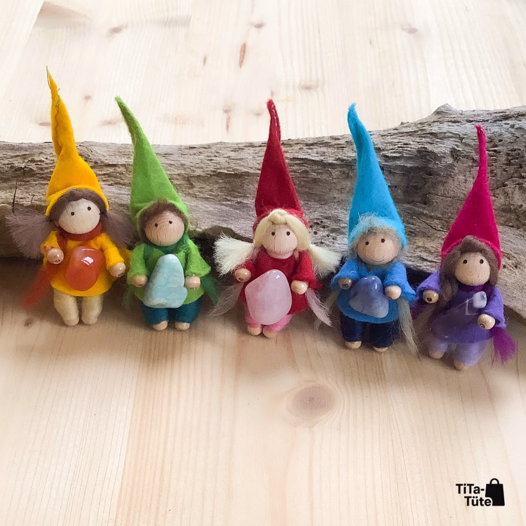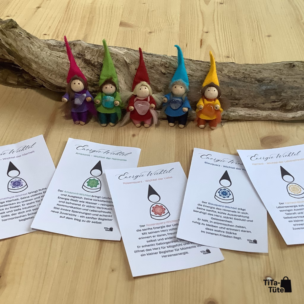 TiTa-Tüte bietet liebevoll gearbeitete Energie-Wichtel aus Filz, die einen echten Edelstein an sich tragen. Jeder Wichtel verkörpert eine besondere Energie – ob Rosenquarz für Liebe, Amethyst für Ruhe oder Karneol für Lebensfreude.
