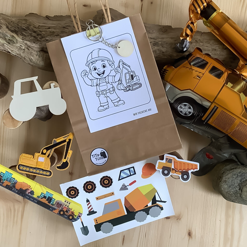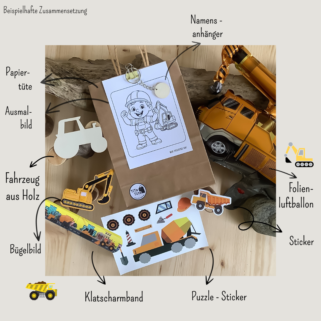 Mit der Baufahrzeug-Mitgebseltüte von TiTa-Tüte wird der Kindergeburtstag zu einem aufregenden Erlebnis für Mädchen und Jungen. Die fertigen Gastgeschenke-Sets / Geschenke-Sets enthalten liebevoll ausgewählte Überraschungen, die perfekt zum Motto Baufahrzeuge passen. Jede Mitgebseltüte ist ein sofort überreichbares Geschenk-Set zum Kindergeburtstag – stressfrei für Eltern, unvergesslich für Kinder.