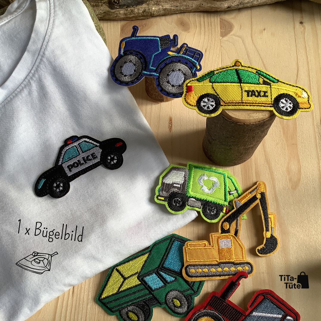 🚧 Fahrzeug-Bügelbild (ca. 5 × 8 cm, z. B. Bagger, Polizei, Krankenwagen) – peppt Kleidung auf